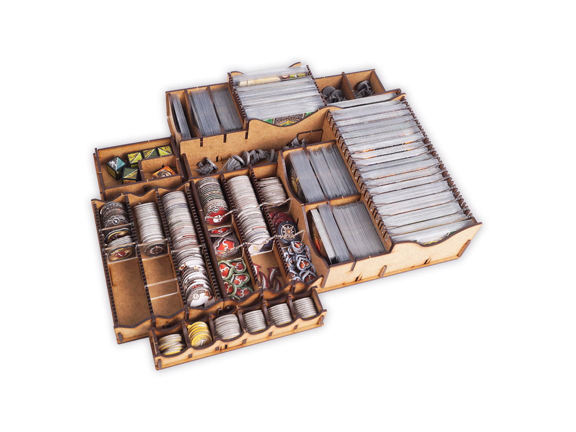 The insert is durable and made of high-quality HDF. To assemble it, there is no glue required. It allows you to hold all components inside the box. You can see the suggested components setup on the pictures. This offer concerns only insert. The game is not included.