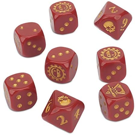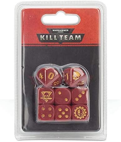 This set contains 6 6-sided dice and 2 10-sided dice - the former used during games of Kill Team, the latter used to roll on certain tables when assembling your squad ready for combat. Themed to match the Adeptus Mechanicus, these dice are red with gold markings. The D6 feature a Adeptus Mechanicus icon in place of the 6 and a Kill Team logo in place of the 1; the D10 feature a skull in place of the 1.