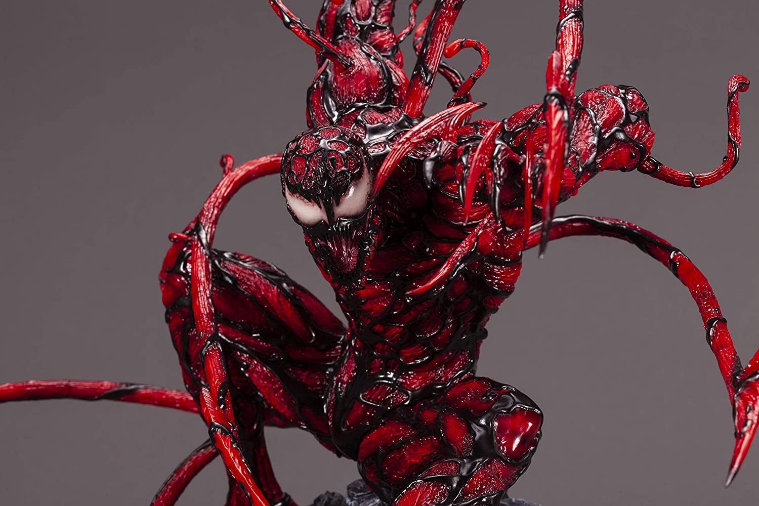 While this statue by itself is already full of impact as it shows a scene of Carnage attacking from the top of a crumbling building on the brink of collapse, but by using the included expansion base, users can also attach ARTFX Venom to this statue to recreate the battle between the two symbiotes.