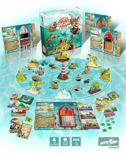 Pebble Rock Delivery Service is a 2 – 4 player “Pick up and Delivery” game in which players race to make deliveries to the friendly critters that live on the islands. A cast of whimsical standees makes the game stand out on any table.