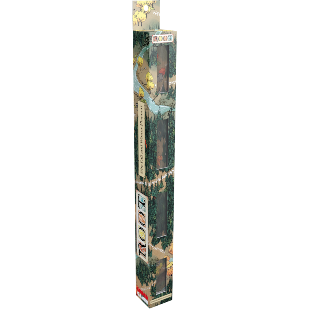 A deluxe double-sided playmat of the mountain and lake game boards from Root: The Underground Expansion.